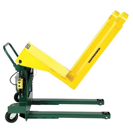 - Price For: Each Fork Length: 40" Includes: Internal Charger, Hand Held Controller, Floor Lock Overall Width: 34" Finish: Machinery Enamel Overall Height: 35-1/8" Caster Wheel Type: (2) Swivel, (2) Rigid Item: Hydraulic Pallet Tilter Tilting Deg.: 85 Degrees Upward Color: Green/Yellow Caster Wheel Material: Phenolic Load Capacity: 2000 lb. Width Across Forks: 24-1/2"