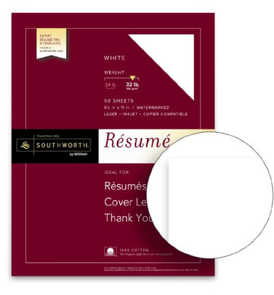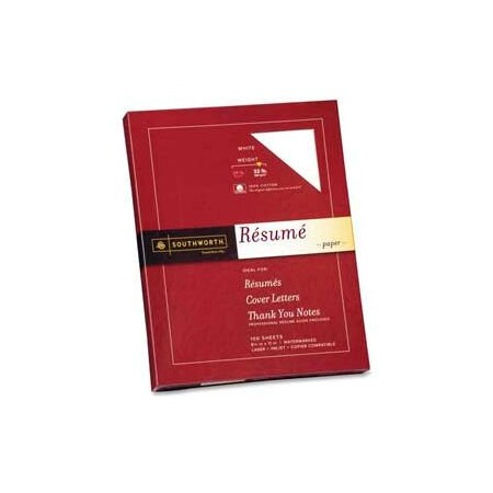Southworth 100% Cotton Resume Paper, White, 32 lbs, 8-1/2 x 11, Wove, 100/Box