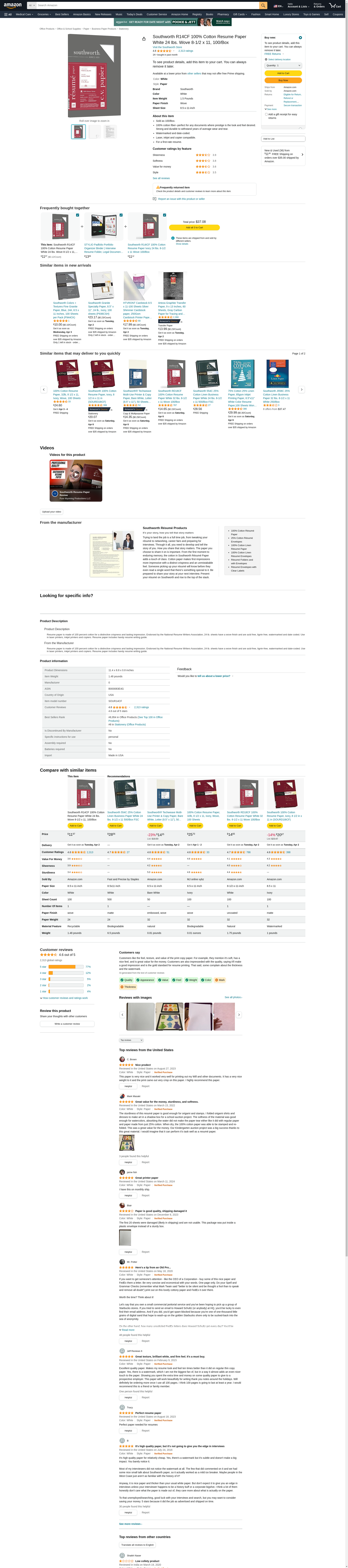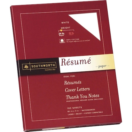 Southworth Exceptional Resume paper. Nothing equals the rich texture of Southworth's 100% Cotton paper. Its distinctive crispness provides a feeling of substance that makes both an immediate and a lasting impression. Watermarked and security date coded. 24 lb, 8.5 Inch x 11 Inch. White, 100 Sheets. Remember to use Southworth 100% Cotton Envelopes and Resume Folders to match your resume papers.
