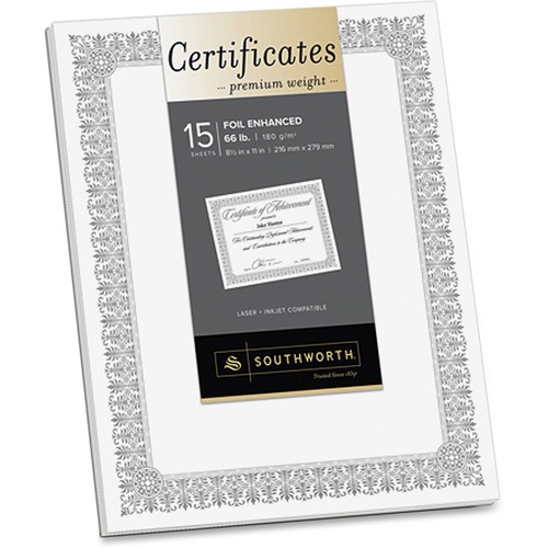 Excellence deserves excellence. Build powerful bonds with a display of appreciation. So much of effective management comes down to recognition, and industry trends show awards for service are being presented more frequently--not just at year's end. Creating a culture of recognition is good for business and can boost morale in every workplace. Look to impress with Southworth premium heavyweight certificates featuring elegant, foil-enhanced border designs. They're suitable for framing and easy to customize for any occasion. Laser, inkjet and copier compatible. Theme: Fleur Border; Shape: Rectangular; Width: 8 1/2"; Height: 11".