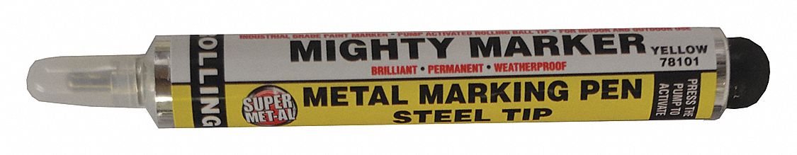 | Feature | <b>Price For:</b> Each <b>Features</b>: Writes through Oil, Grease, and Underwater. Writes on all surfaces. 25-30 minute Dry Time. Pressure Bulb controls paint flow. <b>Standards</b>: OSHA, ASTM D-4236 <b>Item</b>: Rolling Ball Pump Action Oil-Based Paint Marker with Stainless Steel Tip <b>Tip Size</b>: Medium <b>Color</b>: yellow <b>Country of Origin (subject to change)</b>: United States |