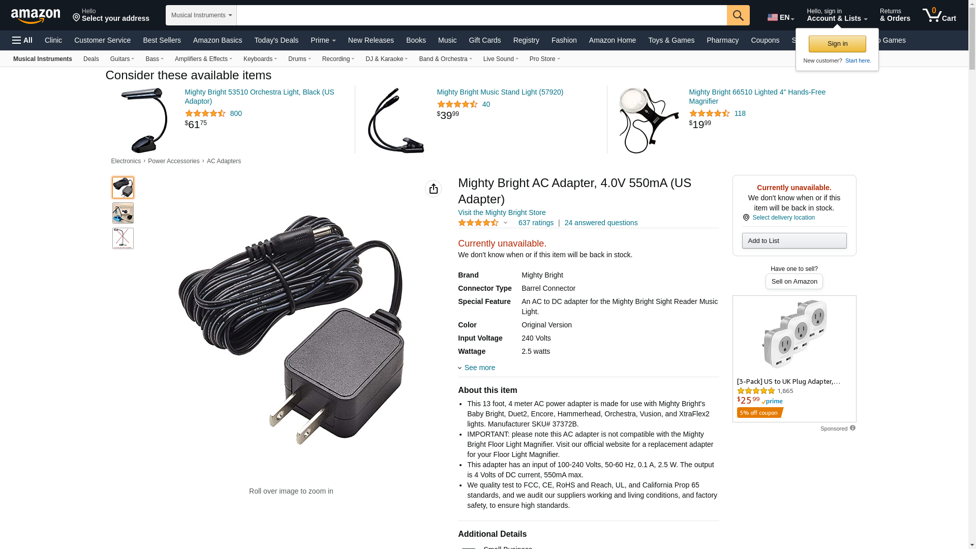 - This 13 foot, 4 meter AC power adapter is made for use with Mighty Bright's Baby Bright, Duet2, Encore, Hammerhead, Orchestra, Vusion, and XtraFlex2 lights. Manufacturer SKU# 37372B.
