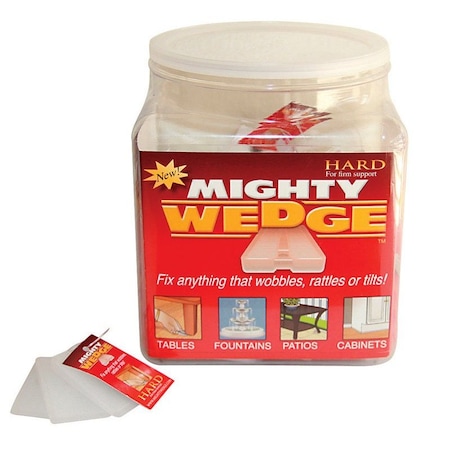 "Mighty Wedge" Hard Wedges Set of 3 Mighty Wedge fixes anything that wobbles, rattles or tilts Pop jar contains 36 sets of 3 Mighty Wedges Hard Mighty Wedges have ridges for interlocking and can easily support 100 lbs. They provide firm support when leveling heavy appliances, fountains, equipment and more