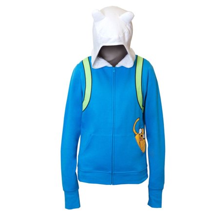 Show your love for Adventure Time with this officially licensed hoodie! This hoodie features Jake in the pocket waving and is in the design of Finn's clothing! Featuring a printed backpack on the back of the hoodie, this hoodie (with faux ears on the hood) is perfect for any fan of Adventure Time!