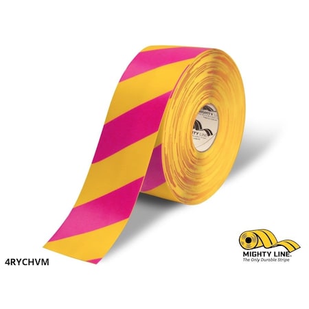 Patented Mighty Line Safety Floor Tape 4 inch by 100 foot Yellow and Magenta diagonal industrial floor marking tape. All our Mighty Line peel-and-stick floor tapes are extremely durable with beveled egdes and tested for improved reliability in harsh industrial environments. Mighty Line floor tapes come with a 3 year limited warranty. This floor tape is also available in 2" width. Part Number: 4RYCHVM