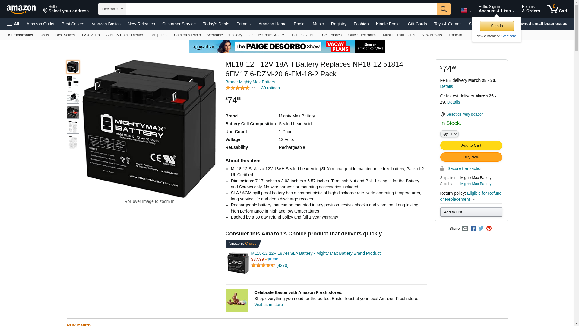 Delivering power when you need it, the Mighty Max ML18-12 12 Volt 18 AH uses a state of the art, heavy-duty, calcium-alloy grid that provides exceptional performance and service life in both float and cyclic applications. The ML18-12 is an Absorbent Glass Mat AGM technology with a valve regulated design, that can be used in enclosed and indoor environments without leaking or maintenance, providing a superior performance for thousands of models. Mighty Max SLA batteries are utilized in a wide variety of applications including; Consumer Electronics, Electric Vehicles, Engine Starters, Golf Carts, Hunting, Lawn and Garden Tools, Medical Mobility, Motorcycles, Power sports, Portable Tools, Solar, Toys and Hobby, Access Control Devices, Emergency Lighting, Security and more.