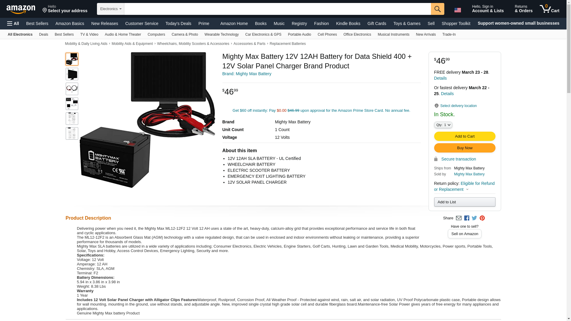 Delivering power when you need it, the Mighty Max ML12-12F2 12 Volt 12 AH uses a state of the art, heavy-duty, calcium-alloy grid that provides exceptional performance and service life in both float and cyclic applications. The ML12-12F2 is an Absorbent Glass Mat AGM technology with a valve regulated design, that can be used in enclosed and indoor environments without leaking or maintenance, providing a superior performance for thousands of models. Mighty Max SLA batteries are utilized in a wide variety of applications including; Consumer Electronics, Electric Vehicles, Engine Starters, Golf Carts, Hunting, Lawn and Garden Tools, Medical Mobility, Motorcycles, Power sports, Portable Tools, Solar, Toys and Hobby, Access Control Devices, Emergency Lighting, Security and more.