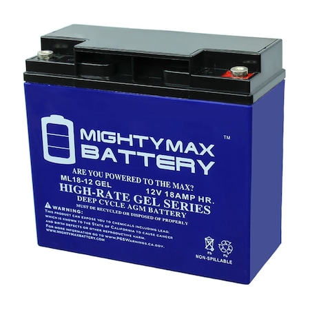 Delivering power when you need it, the Mighty Max ML18-12GEL 12 Volt 18 AH (Maintenance Free) battery. Requires no addition of water during the life of the battery. The Mighty Max ML18-12 GEL is a TRUE DEEP CYCLE battery that can be mounted in any position, requires no maintenance. When a Gel Cell battery is charged, no hazardous fumes escape the battery case, gases are processed within the battery itself.<br>Mighty Max GEL batteries are utilized in a wide variety of applications including; Consumer Electronics, Electric Vehicles, Engine Starters, Golf Carts, Hunting, Lawn and Garden Tools, Medical Mobility, Motorcycles, Power sports, Portable Tools, Solar, Toys and Hobby, Access Control Devices, Emergency Lighting, Security and more<br>Specifications: <br>Voltage: 12 Volt<br>Amperage: 18 AH<br>Chemistry: GEL<br>Terminal: Internal Thread<br>Battery Dimensions:<br>7.13 in x 3.01 in x 6.57 in<br>Weight: 11.90 Lbs<br>Warranty<br>1 Year <br/>Genuine Mighty Max battery Product
