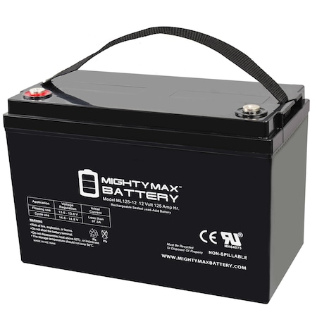 Delivering power when you need it, the Mighty Max ML125-12 12 Volt 125 AH uses a state of the art, heavy-duty, calcium-alloy grid that provides exceptional performance and service life in both float and cyclic applications.<br>The ML125-12 is an Absorbent Glass Mat (AGM) technology with a valve regulated design, that can be used in enclosed and indoor environments without leaking or maintenance, providing a superior performance for thousands of models.<br>Mighty Max SLA batteries are utilized in a wide variety of applications including; Consumer Electronics, Electric Vehicles, Engine Starters, Golf Carts, Hunting, Lawn and Garden Tools, Medical Mobility, Motorcycles, Power sports, Portable Tools, Solar, Toys and Hobby, Access Control Devices, Emergency Lighting, Security and more. <br><b>Specifications:</b><br>Voltage: 12 Volt<br>Amperage: 125 AH<br>Chemistry: SLA, AGM<br><b>Battery Dimensions:</b><br>13.11 in x 6.81 in x 8.74 in<br>Weight: 69.60 Lbs<br><b>Warranty:</b><br>1 Year <br/>Genuine Mighty Max battery Product