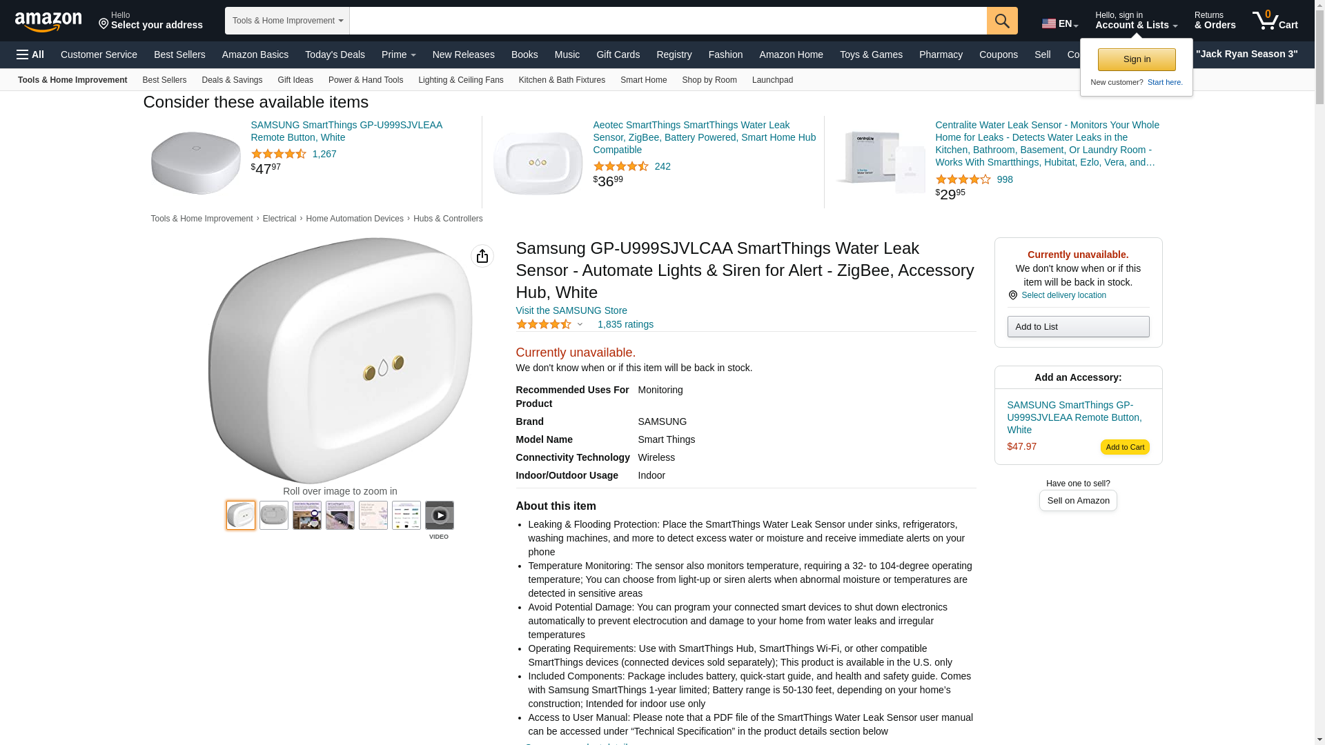 Samsung indoor GP-U999SJVLCAA SmartThings Water Leak Sensor - Automate Lights & Siren for Alert - ZigBee, Accessory Hub, White, 720p