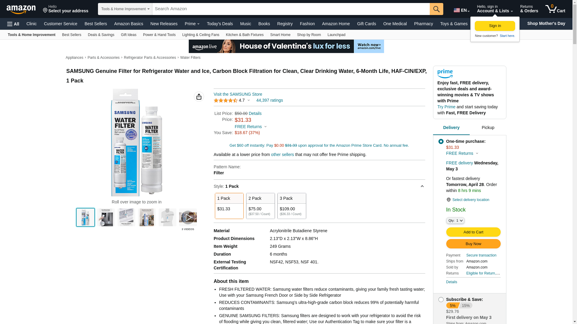 SAMSUNG Genuine Filter for Refrigerator Water and Ice, Carbon Block Filtration for Clean, Clear Drinking Water, 6-Month Life, HAF-CIN/EXP, 1 Pack