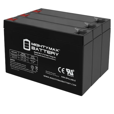 Delivering power when you need it, the Mighty Max ML7-6 6 Volt 7 AH uses a state of the art, heavy-duty, calcium-alloy grid that provides exceptional performance and service life in both float and cyclic applications.<br>The ML7-6 is an Absorbent Glass Mat (AGM) technology with a valve regulated design, that can be used in enclosed and indoor environments without leaking or maintenance, providing a superior performance for thousands of models.<br>Mighty Max SLA batteries are utilized in a wide variety of applications including; Consumer Electronics, Electric Vehicles, Engine Starters, Golf Carts, Hunting, Lawn and Garden Tools, Medical Mobility, Motorcycles, Power sports, Portable Tools, Solar, Toys and Hobby, Access Control Devices, Emergency Lighting, Security and more.<br><b>Specifications: </b><br>Voltage: 6 Volt<br>Amperage: 7 AH<br>Chemistry: SLA, AGM<br>Terminal: F1<br>Quantity: 3 Batteries<br><b>Battery Dimensions: </b><br>5.94 in x 1.42 in x 3.94 in<br>Weight: 2.43 Lbs<br><b>Warranty</b><br>1 Year