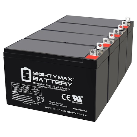 Delivering power when you need it, the Mighty Max ML9-12NB 12 Volt 9 AH uses a state of the art, heavy-duty, calcium-alloy grid that provides exceptional performance and service life in both float and cyclic applications.<br>The ML9-12NB is an Absorbent Glass Mat (AGM) technology with a valve regulated design, that can be used in enclosed and indoor environments without leaking or maintenance, providing a superior performance for thousands of models.<br>Mighty Max SLA batteries are utilized in a wide variety of applications including; Consumer Electronics, Electric Vehicles, Engine Starters, Golf Carts, Hunting, Lawn and Garden Tools, Medical Mobility, Motorcycles, Power sports, Portable Tools, Solar, Toys and Hobby, Access Control Devices, Emergency Lighting, Security and more.<br><b>Specifications: </b><br>Voltage: 12 Volt<br>Amperage: 9 AH<br>Chemistry: SLA, AGM<br>Terminal: Nut and Bolt<br>Quantity: 4 Pack<br><b>Battery Dimensions: </b><br>5.94 in x 2.56 in x 3.94 in<br>Weight: 5.17 Lbs<br><b>Warranty</b><br>1 Year <br/>Genuine Mighty Max battery Product