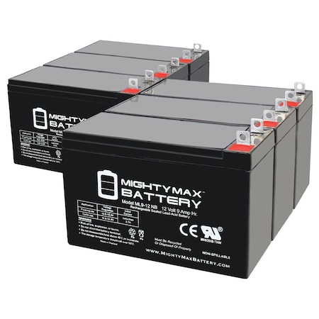 Delivering power when you need it, the Mighty Max ML9-12NB 12 Volt 9 AH uses a state of the art, heavy-duty, calcium-alloy grid that provides exceptional performance and service life in both float and cyclic applications.<br>The ML9-12NB is an Absorbent Glass Mat (AGM) technology with a valve regulated design, that can be used in enclosed and indoor environments without leaking or maintenance, providing a superior performance for thousands of models.<br>Mighty Max SLA batteries are utilized in a wide variety of applications including; Consumer Electronics, Electric Vehicles, Engine Starters, Golf Carts, Hunting, Lawn and Garden Tools, Medical Mobility, Motorcycles, Power sports, Portable Tools, Solar, Toys and Hobby, Access Control Devices, Emergency Lighting, Security and more.<br><b>Specifications: </b><br>Voltage: 12 Volt<br>Amperage: 9 AH<br>Chemistry: SLA, AGM<br>Terminal: Nut and Bolt<br>Quantity: 6 Pack<br><b>Battery Dimensions: </b><br>5.94 in x 2.56 in x 3.94 in<br>Weight: 5.17 Lbs<br><b>Warranty</b><br>1 Year <br/>Genuine Mighty Max battery Product