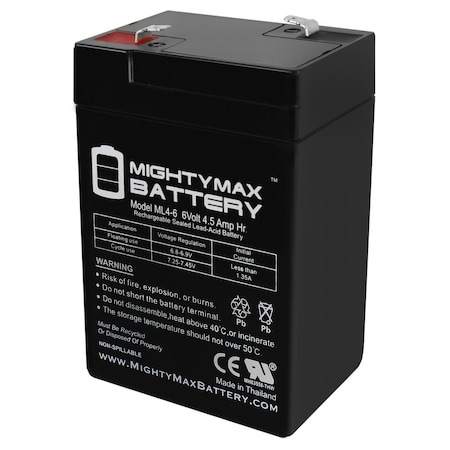 Delivering power when you need it, the Mighty Max ML4-6 6 Volt 4.5 AH uses a state of the art, heavy-duty, calcium-alloy grid that provides exceptional performance and service life in both float and cyclic applications.<br>The ML4-6 is an Absorbent Glass Mat (AGM) technology with a valve regulated design, that can be used in enclosed and indoor environments without leaking or maintenance, providing a superior performance for thousands of models.<br>Mighty Max SLA batteries are utilized in a wide variety of applications including; Consumer Electronics, Electric Vehicles, Engine Starters, Golf Carts, Hunting, Lawn and Garden Tools, Medical Mobility, Motorcycles, Power sports, Portable Tools, Solar, Toys and Hobby, Access Control Devices, Emergency Lighting, Security and more.<br><b>Specifications:</b><br>Voltage: 6 Volt<br>Amperage: 4.5 AH<br>Chemistry: SLA, AGM<br>Terminal: F1<br><b>Battery Dimensions:</b><br>2.76 in x 1.89 in x 4.21 in<br>Weight: 1.83 Lbs<br><b>Warranty</b><br>1 Year