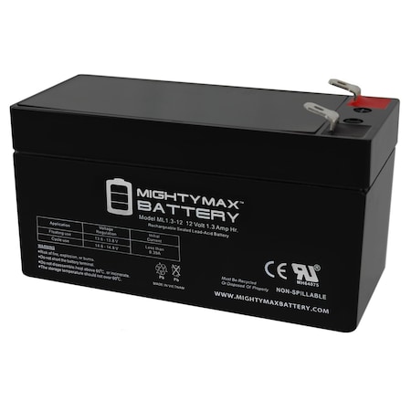 Delivering power when you need it, the Mighty Max ML1.3-12 12 Volt 1.3 AH uses a state of the art, heavy-duty, calcium-alloy grid that provides exceptional performance and service life in both float and cyclic applications.<br>The ML1.3-12 is an Absorbent Glass Mat (AGM) technology with a valve regulated design, that can be used in enclosed and indoor environments without leaking or maintenance, providing a superior performance for thousands of models.<br>Mighty Max SLA batteries are utilized in a wide variety of applications including; Consumer Electronics, Electric Vehicles, Engine Starters, Golf Carts, Hunting, Lawn and Garden Tools, Medical Mobility, Motorcycles, Power sports, Portable Tools, Solar, Toys and Hobby, Access Control Devices, Emergency Lighting, Security and more.<br><b>Specifications:</b><br>Voltage: 12 Volt<br>Amperage: 1.3 AH<br>Chemistry: SLA, AGM<br>Terminal: F1<br><b>Battery Dimensions: </b><br>3.86 in x 1.74 in x 2.32 in<br>Weight: 1.21 Lbs<br><b>Warranty</b><br>1 Year <br/>Genuine Mighty Max battery Product