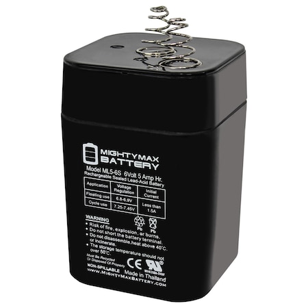 Delivering power when you need it, the Mighty Max ML5-6 6 Volt 5 AH uses a state of the art, heavy-duty, calcium-alloy grid that provides exceptional performance and service life in both float and cyclic applications.<br>The ML5-6S is an Absorbent Glass Mat (AGM) technology with a valve regulated design, that can be used in enclosed and indoor environments without leaking or maintenance, providing a superior performance for thousands of models.<br>6 Volt 5 AH Spring Top Terminals Rechargeable Sealed AGM Maintenance-Free Battery by Mighty Max for Lantern, Portable Light, Flashlight, Fencing, Game Feeder.<br><b>Specifications:</b><br>Voltage: 6 Volt<br>Amperage: 5 AH<br>Chemistry: SLA, AGM<br>Terminal: Spring S2<br><b>Battery Dimensions:</b><br>2.63 in x 2.63 in x 4.50 in<br>Weight: 3.00 Lbs<br><b>Warranty</b><br>1 Year