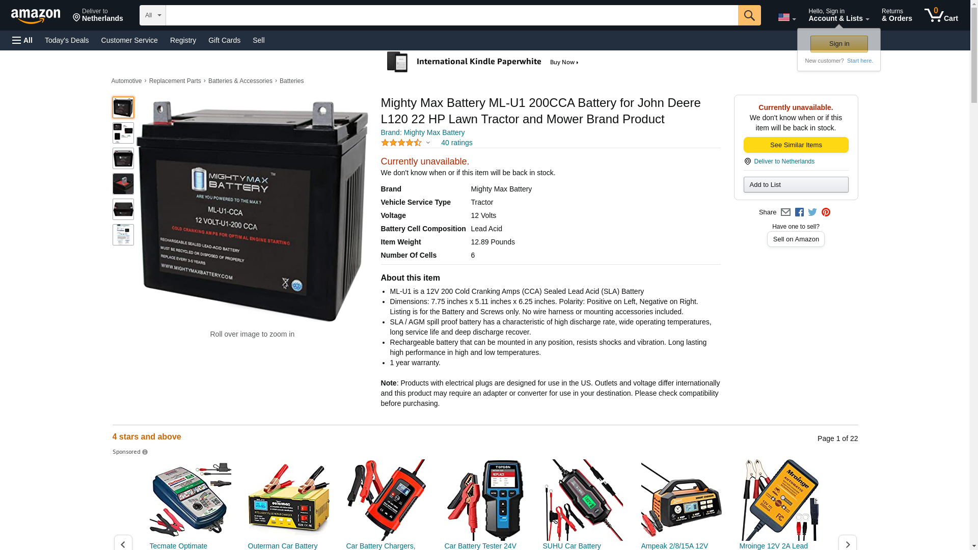 This ML-U1-CCA 12 volts 200 CCA absorbed glass mat (AGM) battery is made with the highest quality pure virgin lead (99.99%) to create a long lasting, durable power source for any machinery requiring a cold cranking power source. <br>The advanced pure lead technology, lower internal resistance and increased plate compression give this battery a longer service life, better deep cycling and overall quicker start-ups for all your lawn and garden machinery. The clever, non-spillable design allows the battery to sit and function in virtually any position increasing your opportunity for ease of mounting. The tough AGM separators and high cell composition increase this batterys vibration resistance up to 20 times more than that of conventional batteries making it perfect for all your lawn and garden machinery. <br><b>Specifications of the ML-U1-CCA Battery</b> <br><br>Voltage: 12 Volt <br>CCA: 200 <br>CA: 280 <br>Chemistry: SLA, AGM <br>Terminal: Nut & Bolt <br><b><br></b><b>Battery Dimensions:</b>7.75 in x 5.11 in x 6.25 in <br>Weight: 12.89 Lbs <br><br><b>Warranty:</b><br>1 Year <br/>Genuine Mighty Max battery Product