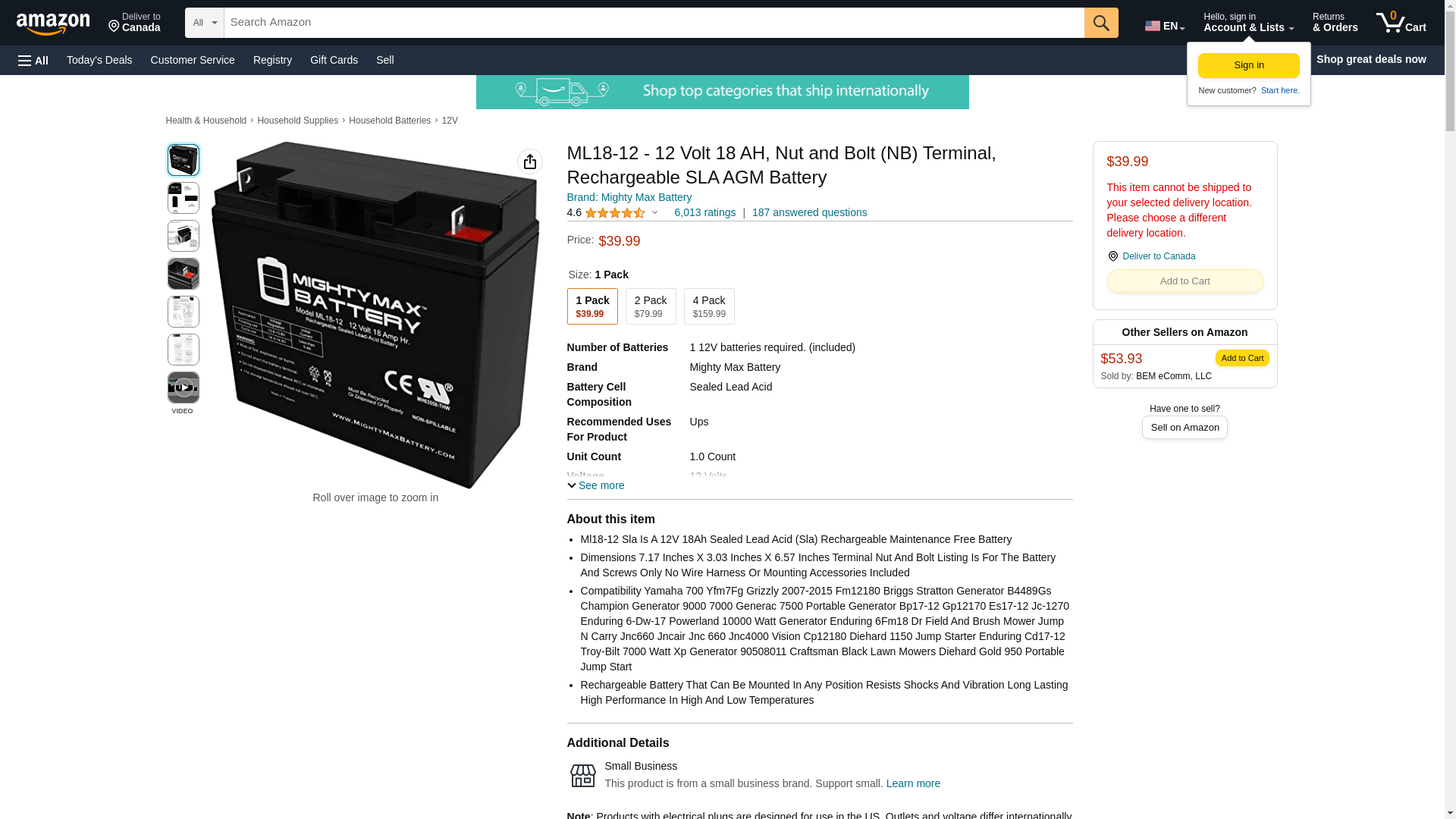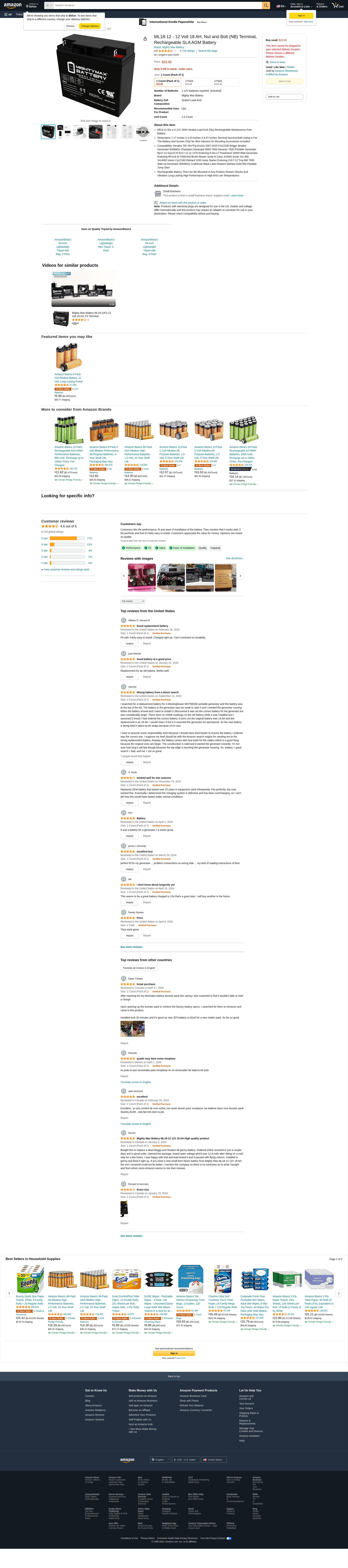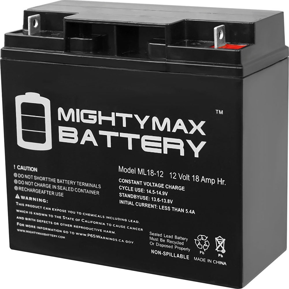 Delivering power when you need it, the Mighty Max ML18-12 12 Volt 18 AH uses a state of the art, heavy-duty, calcium-alloy grid that provides exceptional performance and service life in both float and cyclic applications. The ML18-12 is an Absorbent Glass Mat (AGM) technology with a valve regulated design, that can be used in enclosed and indoor environments without leaking or maintenance, providing a superior performance for thousands of models. SLA / AGM spill proof battery has a characteristic of high discharge rate, wide operating temperatures, long service life and deep discharge recover. Rechargeable battery that can be mounted in any position, resists shocks and vibration. Long lasting high performance in high and low temperatures. Mighty Max SLA batteries are utilized in a wide variety of applications including; Consumer Electronics, Electric Vehicles, Engine Starters, Golf Carts, Hunting, Lawn and Garden Tools, Medical Mobility, Motorcycles, Power sports, Portable Tools, Solar, Toys and Hobby, Access Control Devices, Emergency Lighting, Security and more. Nut and Bolt Terminal, Charger is not included.