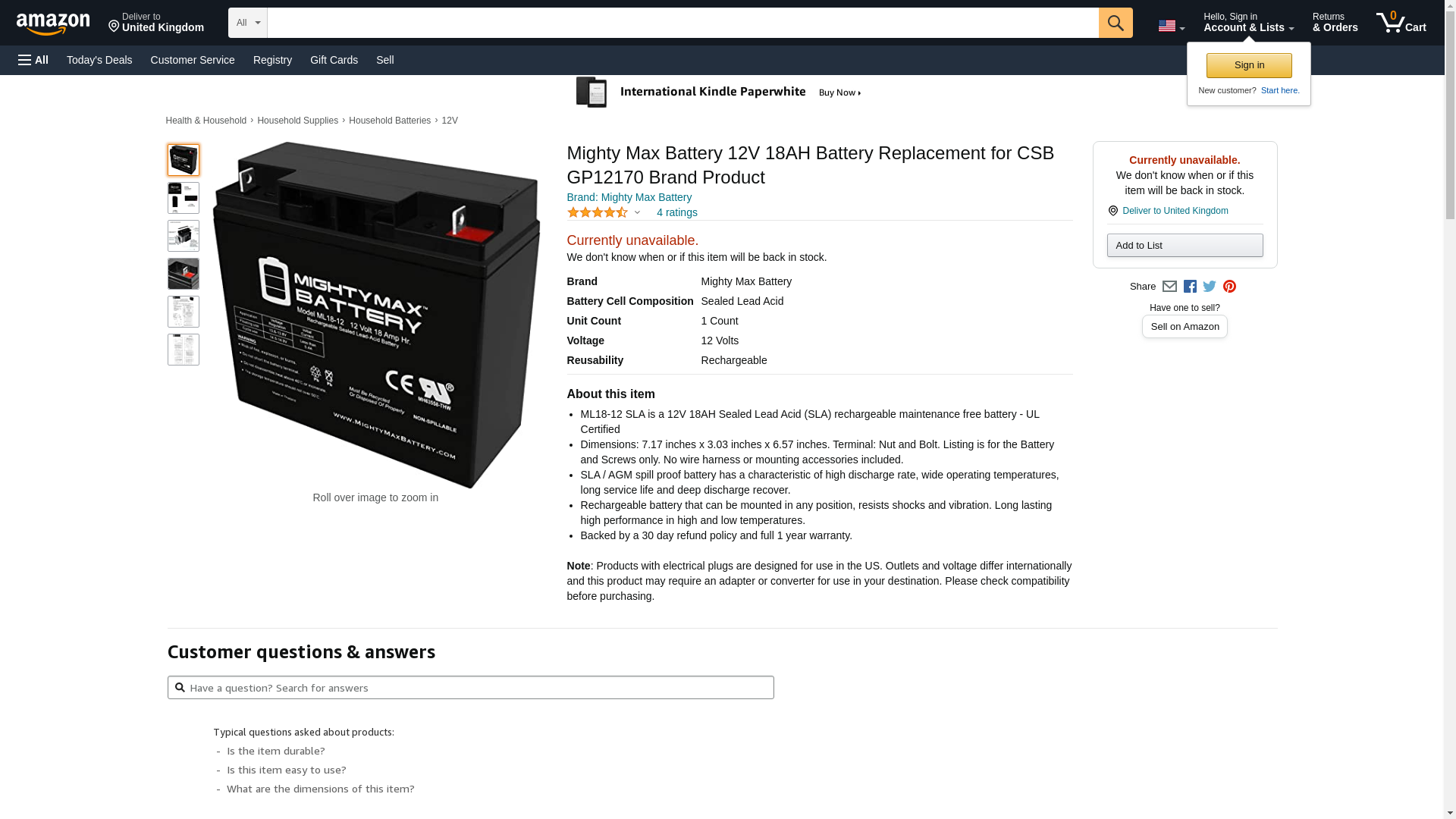 Delivering power when you need it, the Mighty Max ML18-12 12 Volt 18 AH uses a state of the art, heavy-duty, calcium-alloy grid that provides exceptional performance and service life in both float and cyclic applications.<br>The ML18-12 is an Absorbent Glass Mat (AGM) technology with a valve regulated design, that can be used in enclosed and indoor environments without leaking or maintenance, providing a superior performance for thousands of models.<br>Mighty Max SLA batteries are utilized in a wide variety of applications including; Consumer Electronics, Electric Vehicles, Engine Starters, Golf Carts, Hunting, Lawn and Garden Tools, Medical Mobility, Motorcycles, Power sports, Portable Tools, Solar, Toys and Hobby, Access Control Devices, Emergency Lighting, Security and more. <br><b>Specifications: </b><br>Voltage: 12 Volt<br>Amperage: 18 AH<br>Chemistry: SLA, AGM<br>Terminal: Nut and Bolt (NB)<br><b>Battery Dimensions:</b><br>7.17 in x 3.03 in x 6.57 in<br>Weight: 11.90 Lbs<br><b>Warranty</b><br>1 Year <br/>Genuine Mighty Max battery Product