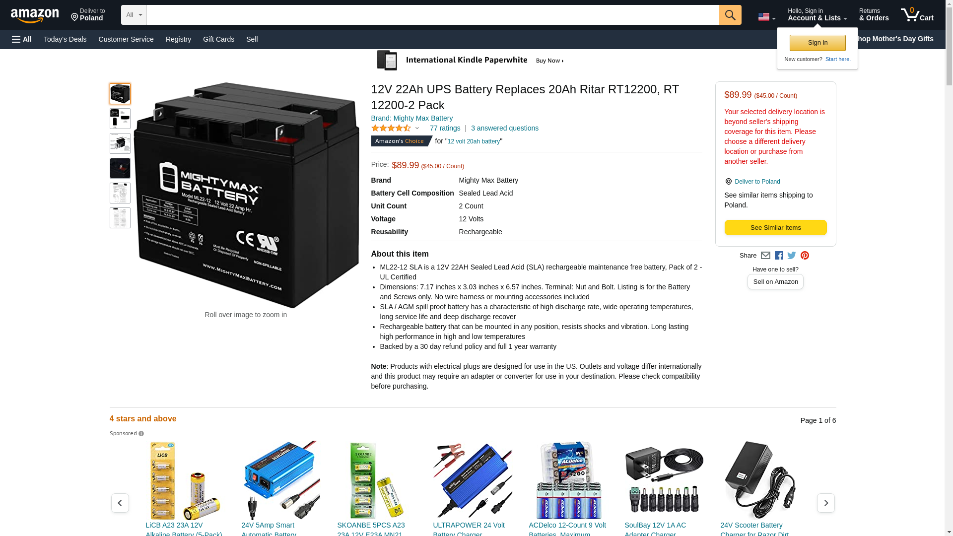 - ML22-12 SLA is a 12V 22AH Sealed Lead Acid (SLA) rechargeable maintenance free battery, Pack of 2 - UL Certified