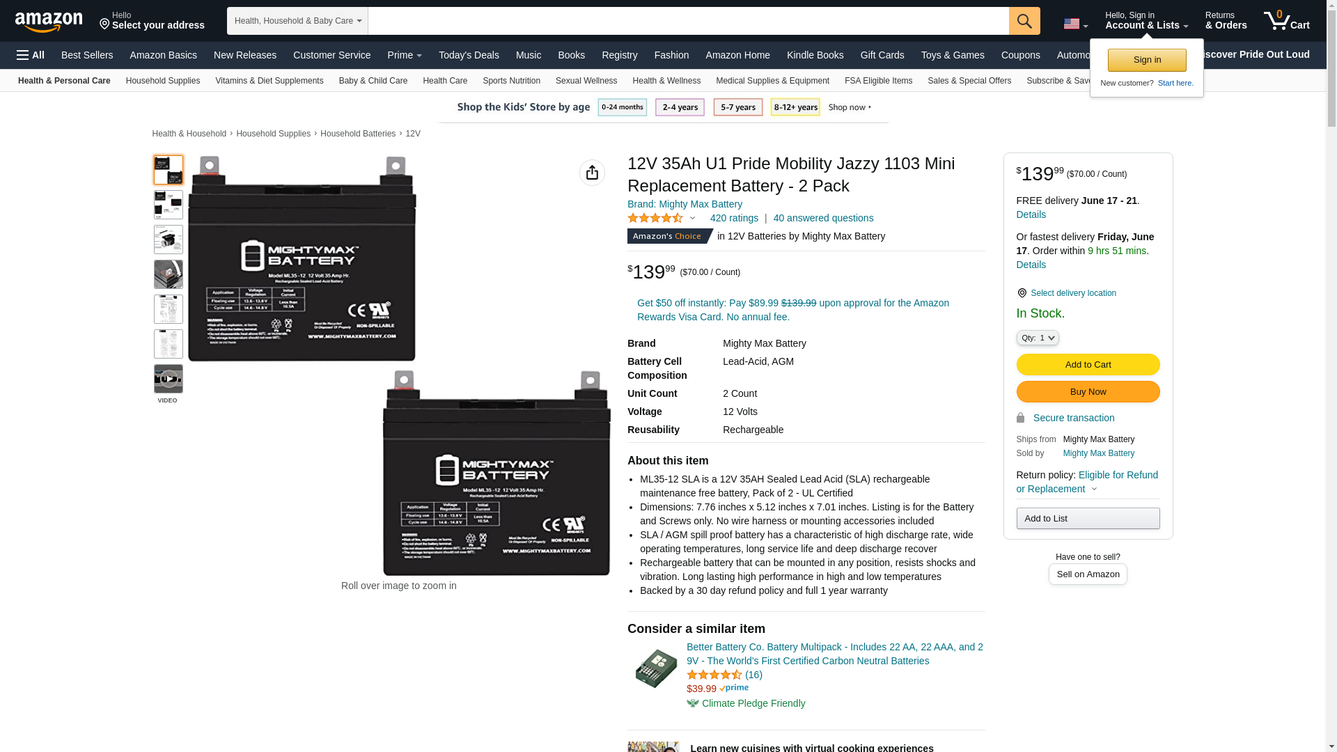 Mighty Max Battery 12V 35Ah U1 Pride Mobility Jazzy 1103 Mini Replacement Battery - 2 Pack