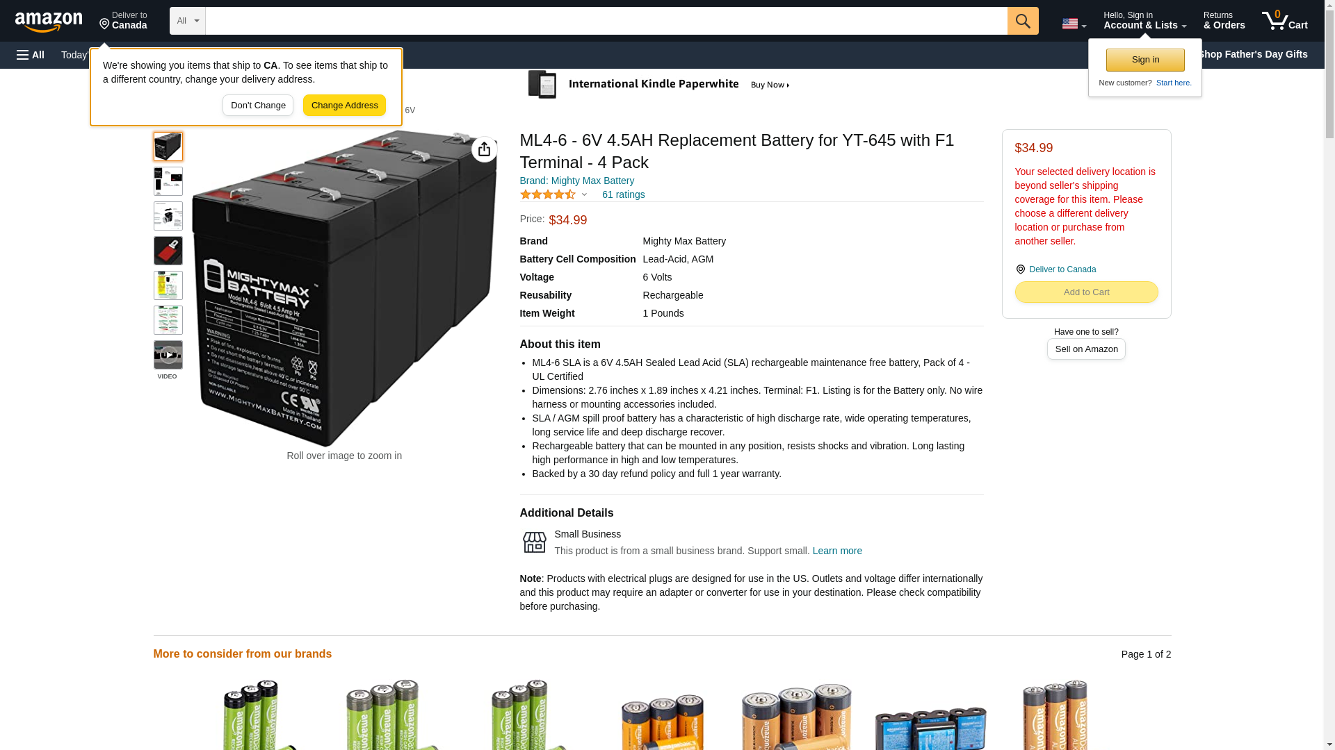 Delivering power when you need it, the Mighty Max ML4-6 6 Volt 4.5 AH uses a state of the art, heavy-duty, calcium-alloy grid that provides exceptional performance and service life in both float and cyclic applications.<br>The ML4-6 is an Absorbent Glass Mat (AGM) technology with a valve regulated design, that can be used in enclosed and indoor environments without leaking or maintenance, providing a superior performance for thousands of models.<br>Mighty Max SLA batteries are utilized in a wide variety of applications including; Consumer Electronics, Electric Vehicles, Engine Starters, Golf Carts, Hunting, Lawn and Garden Tools, Medical Mobility, Motorcycles, Power sports, Portable Tools, Solar, Toys and Hobby, Access Control Devices, Emergency Lighting, Security and more.<br><b>Specifications: </b><br>Voltage: 6 Volt<br>Amperage: 4.5 AH<br>Chemistry: SLA, AGM<br>Terminal: F1<br>Quantity: 4 Batteries<br><b>Battery Dimensions: </b><br>2.76 in x 1.89 in x 4.21 in<br>Weight: 1.83 Lbs<br><b>Warranty</b><br>1 Year <br/>Genuine Mighty Max battery Product
