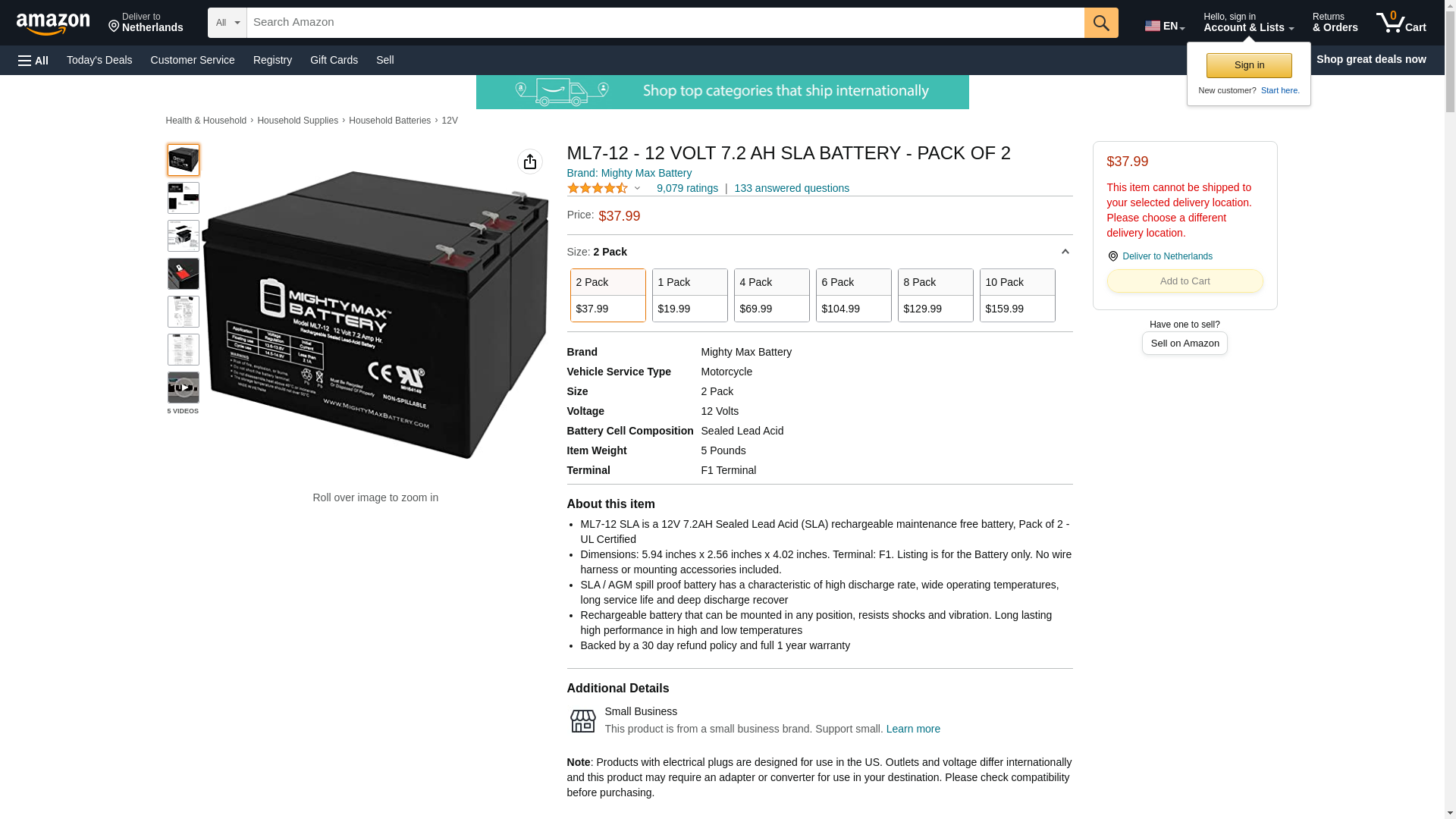 Delivering power when you need it, the Mighty Max ML7-12 12 Volt 7.2 AH uses a state of the art, heavy-duty, calcium-alloy grid that provides exceptional performance and service life in both float and cyclic applications.<br>The ML7-12 is an Absorbent Glass Mat (AGM) technology with a valve regulated design, that can be used in enclosed and indoor environments without leaking or maintenance, providing a superior performance for thousands of models.<br>Mighty Max SLA batteries are utilized in a wide variety of applications including; Consumer Electronics, Electric Vehicles, Engine Starters, Golf Carts, Hunting, Lawn and Garden Tools, Medical Mobility, Motorcycles, Power sports, Portable Tools, Solar, Toys and Hobby, Access Control Devices, Emergency Lighting, Security and more.<br><b>Specifications: </b><br>Voltage: 12 Volt<br>Amperage: 7.2 AH<br>Chemistry: SLA, AGM<br>Terminal: F1<br>Quantity: 2 Batteries<br><b>Battery Dimensions: </b><br>5.94 in x 2.56 in x 4.02 in<br>Weight: 4.50 Lbs<br><b>Warranty</b><br>1 Year