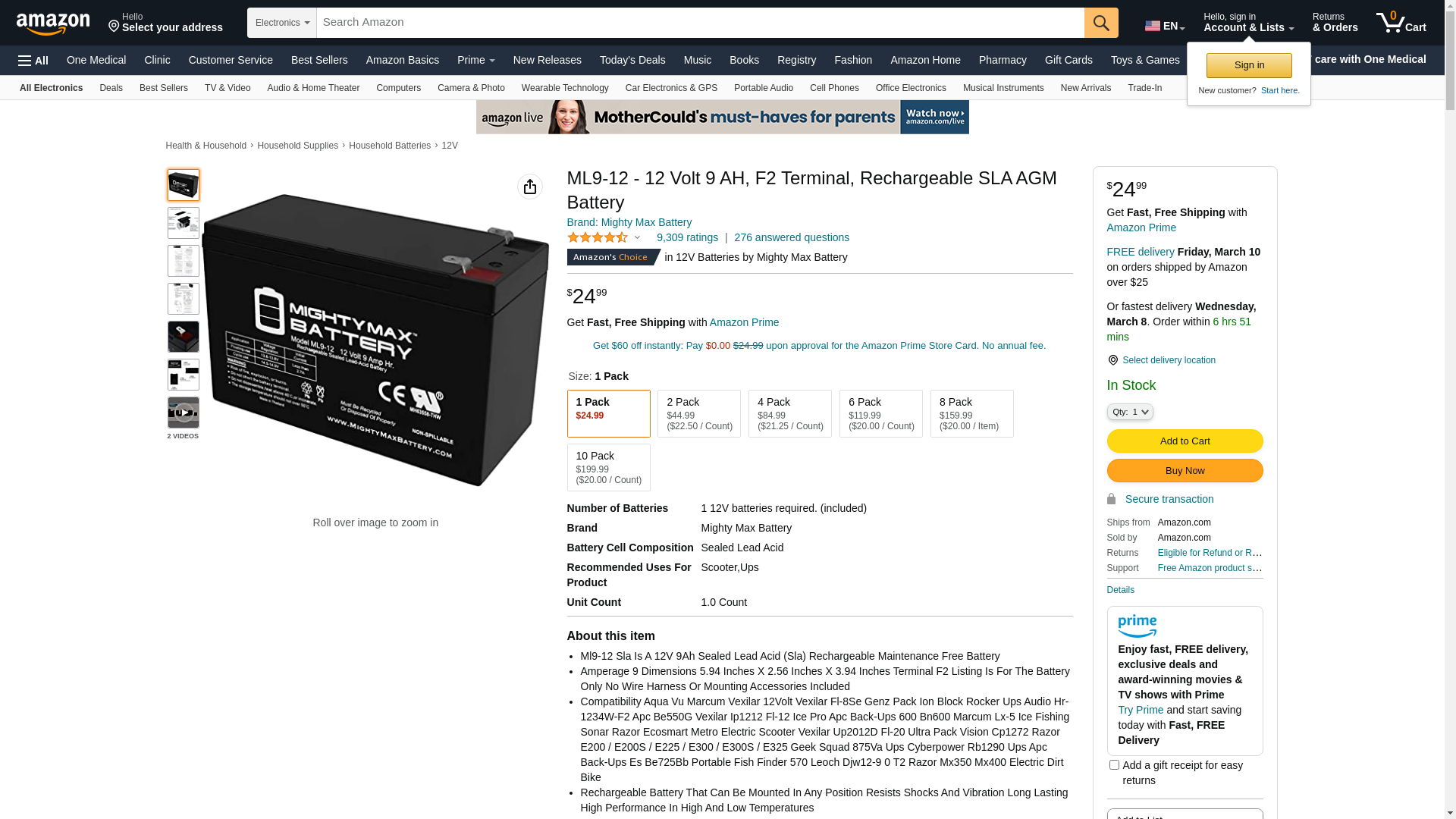 ML9-12 - 12 Volt 9 AH, F2 Terminal, Rechargeable SLA AGM Battery,Pack of 1