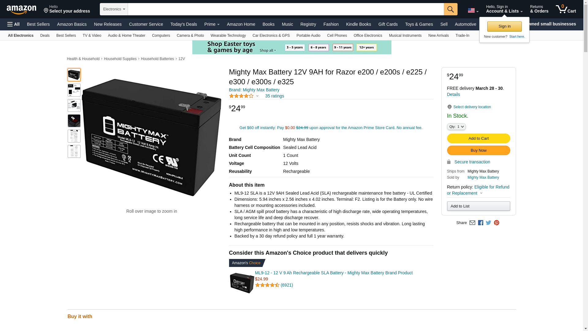 Mighty Max Battery 12V 9AH for Razor e200 / e200s / e225 / e300 / e300s / e325