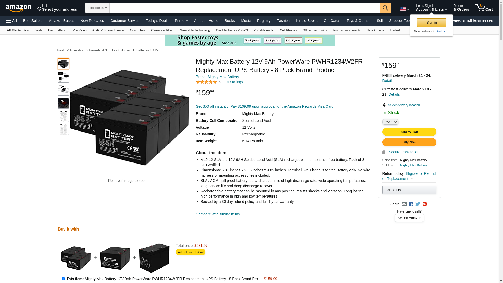 Delivering power when you need it, the Mighty Max ML9-12 12 Volt 9 AH uses a state of the art, heavy-duty, calcium-alloy grid that provides exceptional performance and service life in both float and cyclic applications.<br>The ML9-12 is an Absorbent Glass Mat (AGM) technology with a valve regulated design, that can be used in enclosed and indoor environments without leaking or maintenance, providing a superior performance for thousands of models.<br>Mighty Max SLA batteries are utilized in a wide variety of applications including; Consumer Electronics, Electric Vehicles, Engine Starters, Golf Carts, Hunting, Lawn and Garden Tools, Medical Mobility, Motorcycles, Power sports, Portable Tools, Solar, Toys and Hobby, Access Control Devices, Emergency Lighting, Security and more.<br><b>Specifications: </b><br>Voltage: 12 Volt<br>Amperage: 9 AH<br>Chemistry: SLA, AGM<br>Terminal: F2<br>Quantity: 8 Batteries<br><b>Battery Dimensions: </b><br>5.94 in x 2.56 in x 4.02 in<br>Weight: 5.10 Lbs<br><b>Warranty</b><br>1 Year <br/>Genuine Mighty Max battery Product