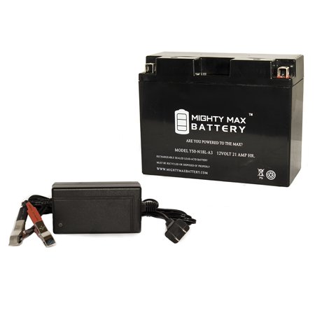 <div> This Y50-N18L-A3 is a sealed lead-acid (SLA) absorbed glass mat (AGM) rechargeable battery. AGM and GEL batteries are lead-acid and of the same battery chemistry. This battery comes already charged, sealed, maintenance free, and ready to install. </div> <div> <br /> </div> <div> Premium quality absorbed glass mat technology (AGM) is ideal for ATVs, Motorcycles, Personal Watercraft, Jet Ski's, Snowmobiles and more. </div> <div> <br /> </div> <div> Specifications of the Y50-N18L-A3 Battery </div> <div> <br /> </div> <div> Voltage: 12 Volt </div> <div> <br /> </div> <div> Amperage: 21 AH </div> <div> <br /> </div> <div> Chemistry: SLA, AGM </div> <div> <br /> </div> <div> Terminal: Nut & Bolt </div> <div> <br /> </div> <div> Battery Dimensions: </div> <div> <br /> </div> <div> 8.07 in x 3.42 in x 6.37 in </div> <div> <br /> </div> <div> Weight: 14.55 Lbs </div> <div> <br /> </div> <div> Warranty </div> <div> <br /> </div> <div> 1 Year </div> <div> <br /> </div> <div> The Mighty Max 3 stage professional charger and maintainer comes with secured alligator clips that ensures the battery to charge properly. Compact, Light and Powerful the Mighty Max charger provides an enhanced charging method that will not damage your batteries when left connected. Mighty Max charger provides a short circuit protection, enabling the product to charge fully. </div> <div> <br /> </div> <div> Features; </div> <div> Mighty Max 12 Volt 4 Amp charger with Alligator clips </div> <div> 3 stage charging method ensuring full charge, avoiding over-charging </div> <div> Float charge to ensure the batteries life </div> <div> Temperature / Short Circuit protection </div> <div> Dual color LED - showing operation of charging progress </div>