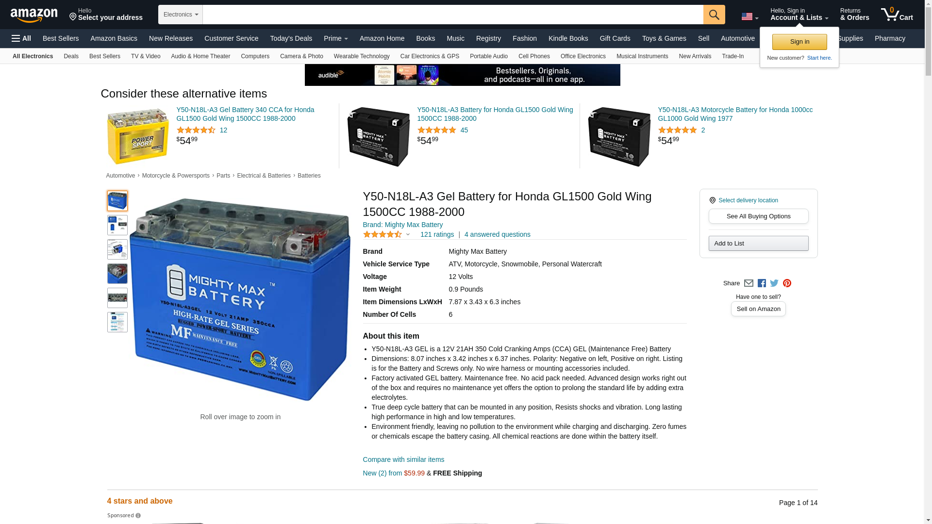 Mighty Max Battery Y50-N18L-A3 Gel Battery for Honda GL1500 Gold Wing 1500CC 1988-2000
