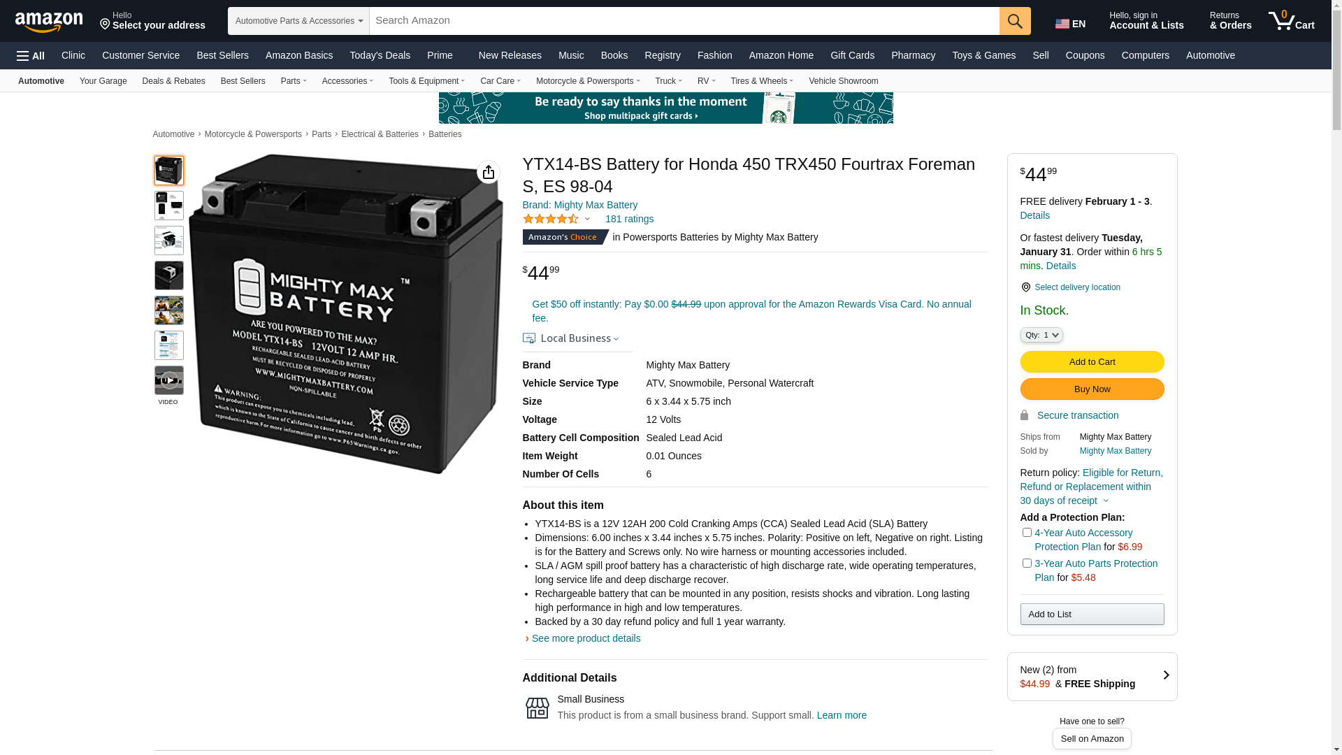 Mighty Max Battery YTX14-BS Battery for Honda 450 TRX450 Fourtrax Foreman S, ES 98-04