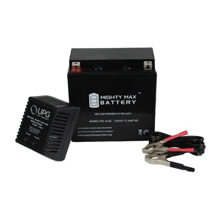<div> This YTX14-BS is a sealed lead-acid (SLA) absorbed glass mat (AGM) rechargeable battery. AGM and GEL batteries are lead-acid and of the same battery chemistry. This battery comes already charged, sealed, maintenance free, and ready to install. </div> <div> <br /> </div> <div> Premium quality absorbed glass mat technology (AGM) is ideal for ATVs, Motorcycles, Personal Watercraft, Jet Ski's, Snowmobiles and more. </div> <div> <br /> </div> <div> <b>Specifications of the YTX14-BS Battery</b> </div> <div> <br /> </div> <div> Voltage: 12 Volt </div> <div> <br /> </div> <div> Amperage: 12 AH </div> <div> <br /> </div> <div> Chemistry: SLA, AGM </div> <div> <br /> </div> <div> Terminal: Nut & Bolt </div> <div> <br /> </div> <div> <b>Battery Dimensions: </b> </div> <div> <br /> </div> <div> 6.00 in x 3.44 in x 5.75 in </div> <div> <br /> </div> <div> Weight: 9.92 Lbs </div> <div> <br /> </div> <div> <b>Warranty</b> </div> <div> <br /> </div> <div> 1 Year </div> <div> <br /> </div> <div> <b>12V 1 Amp Charger:</b> </div> <div> <br /> </div> <div> The Professional Power Charger and Maintainer. Compact, Light and Powerful. </div> <div> Includes Quick Connect Rings and Alligator Clips. Maintains a Full Charge When Left Connected To The Battery and Engineered For Enhanced Safe Charging. </div>
