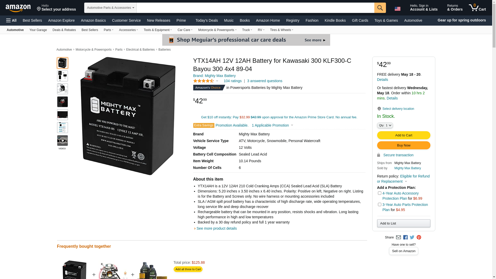 This YTX14AH is a sealed lead-acid (SLA) absorbed glass mat (AGM) rechargeable battery. AGM and GEL batteries are lead-acid and of the same battery chemistry. This battery comes already charged, sealed, maintenance free, and ready to install.<br>Premium quality absorbed glass mat technology (AGM) is ideal for ATVs, Motorcycles, Personal Watercraft, Jet Ski's, Snowmobiles and more.<br><b>Specifications of the YTX14AH Battery</b><br>Voltage: 12 Volt<br>Amperage: 12 AH<br>Chemistry: SLA, AGM<br>Terminal: Nut & Bolt <br><b>Battery Dimensions: </b><br>5.20 in x 3.50 in x 6.40 in<br>Weight: 10.14 Lbs<br><b>Warranty</b><br>1 Year <br/>Genuine Mighty Max battery Product