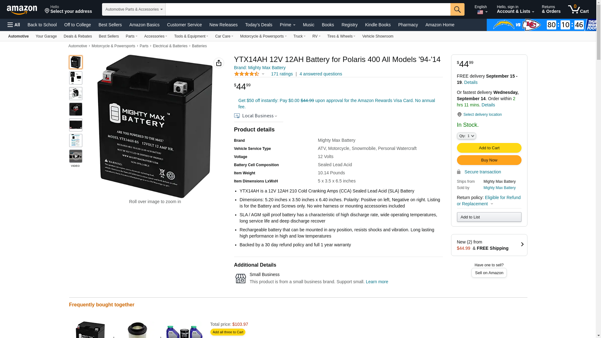 This YTX14AH is a sealed lead-acid (SLA) absorbed glass mat (AGM) rechargeable battery. AGM and GEL batteries are lead-acid and of the same battery chemistry. This battery comes already charged, sealed, maintenance free, and ready to install.<br>Premium quality absorbed glass mat technology (AGM) is ideal for ATVs, Motorcycles, Personal Watercraft, Jet Ski's, Snowmobiles and more.<br><b>Specifications of the YTX14AH Battery</b><br>Voltage: 12 Volt<br>Amperage: 12 AH<br>Chemistry: SLA, AGM<br>Terminal: Nut & Bolt <br><b>Battery Dimensions: </b><br>5.20 in x 3.50 in x 6.40 in<br>Weight: 10.14 Lbs<br><b>Warranty</b><br>1 Year <br/>Genuine Mighty Max battery Product