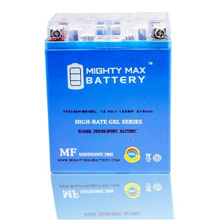 The YTX14AH GEL is a 12V 12AH GEL (Maintenance Free) battery. Requires no addition of water during the life of the battery. The Mighty Max YTX14AH GEL is a TRUE DEEP CYCLE battery that can be mounted in any position, requires no maintenance. When a Gel Cell battery is charged, no hazardous fumes escape the battery case, gases are processed within the battery itself.<br>Common uses for the YTX14AH GEL: ATVs, Motorcycles, Personal Watercraft, Jet Ski's, Snowmobiles and more.<br><b>The Performance and Characteristic of the YTX14AH GEL Battery</b><br>Maintenance Free / GEL configuration <br>No leaks, spills or contact with acid <br>No acid mist and pollution to the environment when charging and discharging. <br>High capacity: 10-20% higher comparing to that of VRLA.<br>Low self-discharging and durable for storage.<br>Nice ability for resilience after over-discharge and the capacity of high discharge current increases by 30% over VRLA.<br>Amazing performances in all temperature conditions<br>Battery Dimensions in Inches : L (5.20) x W (3.50) x H (6.40) <br/>Genuine Mighty Max battery Product