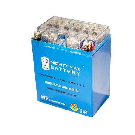 <div> The YTX14AHL GEL is a 12V 12AH GEL (Maintenance Free) battery. Requires no addition of water during the life of the battery. The Mighty Max YTX14AHL GEL is a TRUE DEEP CYCLE battery that can be mounted in any position, requires no maintenance. When a Gel Cell battery is charged, no hazardous fumes escape the battery case, gases are processed within the battery itself. </div> <div> <br /> </div> <div> Common uses for the YTX14AHL GEL: ATVs, Motorcycles, Personal Watercraft, Jet Ski's, Snowmobiles and more. </div> <div> <br /> </div> <div> <b>The Performance and Characteristic of the YTX14AHL GEL Battery</b> </div> <div> <br /> </div> <div> Maintenance Free / GEL configuration </div> <div> No leaks, spills or contact with acid </div> <div> No acid mist and pollution to the environment when charging and discharging. </div> <div> High capacity: 10-20% higher comparing to that of VRLA. </div> <div> Low self-discharging and durable for storage. </div> <div> Nice ability for resilience after over-discharge and the capacity of high discharge current increases by 30% over VRLA. </div> <div> Amazing performances in all temperature conditions </div> <div> Battery Dimensions in Inches : L (5.27) x W (3.50) x H (6.53) </div>