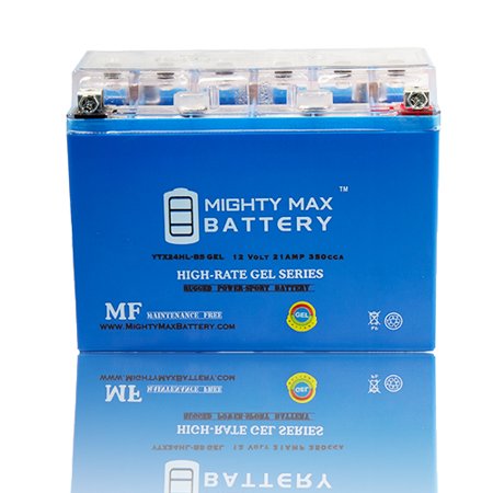 The YTX24HL-BS GEL is a 12V 21AH GEL (Maintenance Free) battery. Requires no addition of water during the life of the battery. The Mighty Max YTX24HL-BS GEL is a TRUE DEEP CYCLE battery that can be mounted in any position, requires no maintenance. When a Gel Cell battery is charged, no hazardous fumes escape the battery case, gases are processed within the battery itself.<br>Common uses for the YTX24HL-BS GEL: ATVs, Motorcycles, Personal Watercraft, Jet Ski's, Snowmobiles and more.<br><b>The Performance and Characteristic of the YTX24HL-BSGEL Battery</b><br>Maintenance Free / GEL configuration <br>No leaks, spills or contact with acid <br>No acid mist and pollution to the environment when charging and discharging. <br>High capacity: 10-20% higher comparing to that of VRLA.<br>Low self-discharging and durable for storage.<br>Nice ability for resilience after over-discharge and the capacity of high discharge current increases by 30% over VRLA.<br>Amazing performances in all temperature conditions<br>Battery Dimensions in Inches : L (8.07) x W (3.42) x H (6.37) <br/>Genuine Mighty Max battery Product