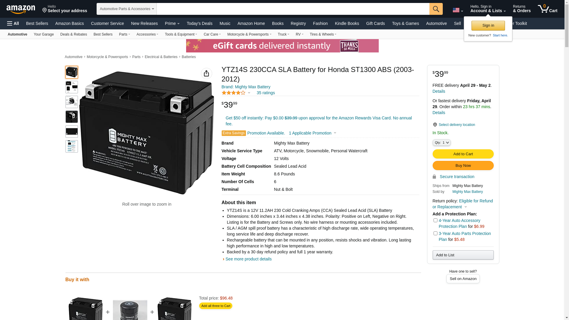 This YTZ14S is a sealed lead-acid (SLA) absorbed glass mat (AGM) rechargeable battery. AGM and GEL batteries are lead-acid and of the same battery chemistry. This battery comes already charged, sealed, maintenance free, and ready to install.<br>Premium quality absorbed glass mat technology (AGM) is ideal for ATVs, Motorcycles, Personal Watercraft, Jet Ski's, Snowmobiles and more.<br><b>Specifications of the YTZ14S Battery</b><br>Voltage: 12 Volt<br>Amperage: 11.2 AH<br>Chemistry: SLA, AGM<br>Terminal: Nut & Bolt <br><b>Battery Dimensions: </b><br>6.00 in x 3.44 in x 4.38 in<br>Weight: 8.60 Lbs<br><b>Warranty</b><br>1 Year <br/>Genuine Mighty Max battery Product