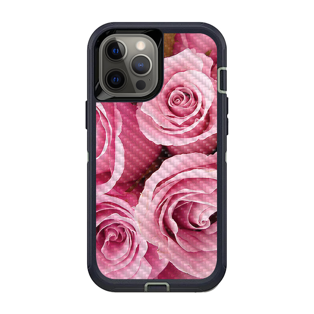 MightySkins CF-OTDIP12PRM-Pink Roses Carbon Fiber Skin for OtterBox Defender iPhone 12 Pro Max - Pink Roses
