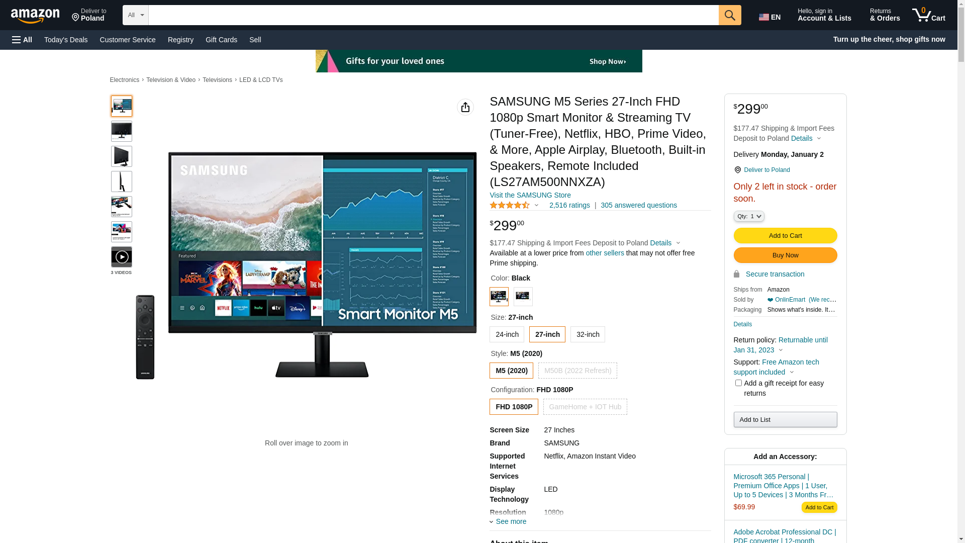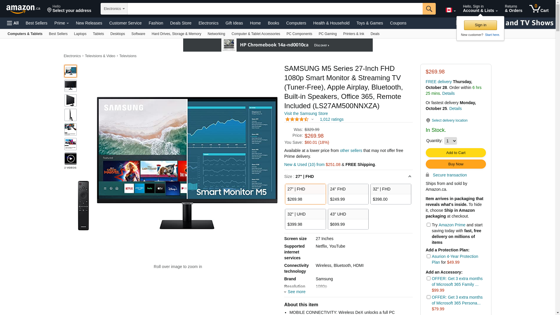 SAMSUNG M5 Series 27-Inch FHD 1080p Smart Monitor & Streaming TV (Tuner-Free), Netflix, HBO, Prime Video, & More, Apple Airplay, Bluetooth, Built-in Speakers, Remote Included (LS27AM500NNXZA)