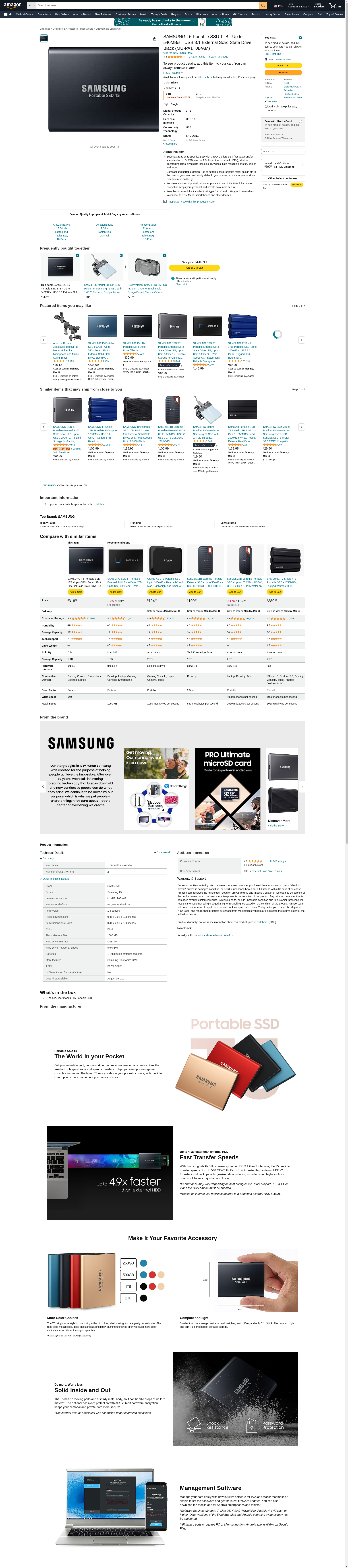 SAMSUNG T5 Portable SSD 1TB - Up to 540MB/s - USB 3.1 External Solid State Drive, Black (MU-PA1T0B/AM)