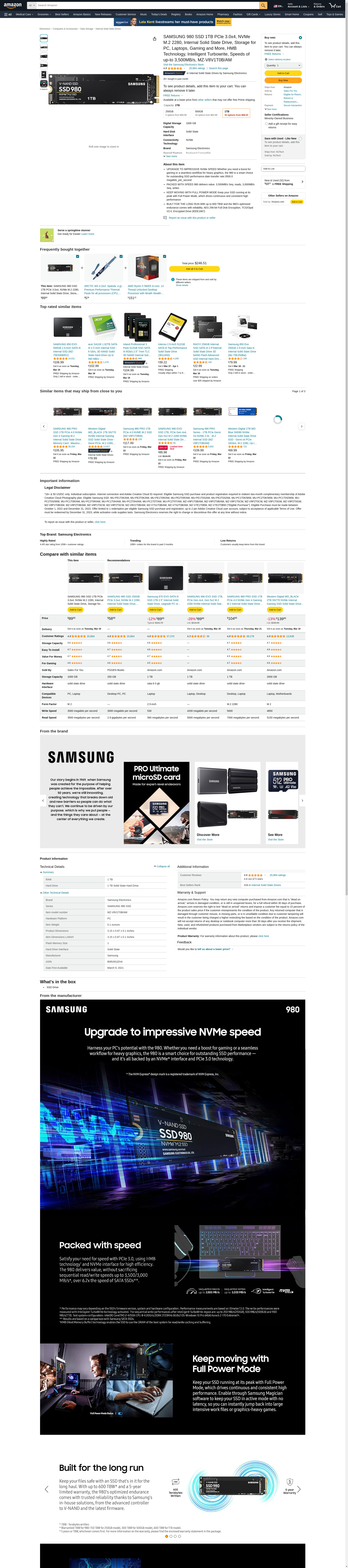 SAMSUNG 980 SSD 1TB PCle 3.0x4, NVMe M.2 2280, Internal Solid State Drive, Storage for PC, Laptops, Gaming and More, HMB Technology, Intelligent Turbowrite, Speeds of up-to 3,500MB/s, MZ-V8V1T0B/AM