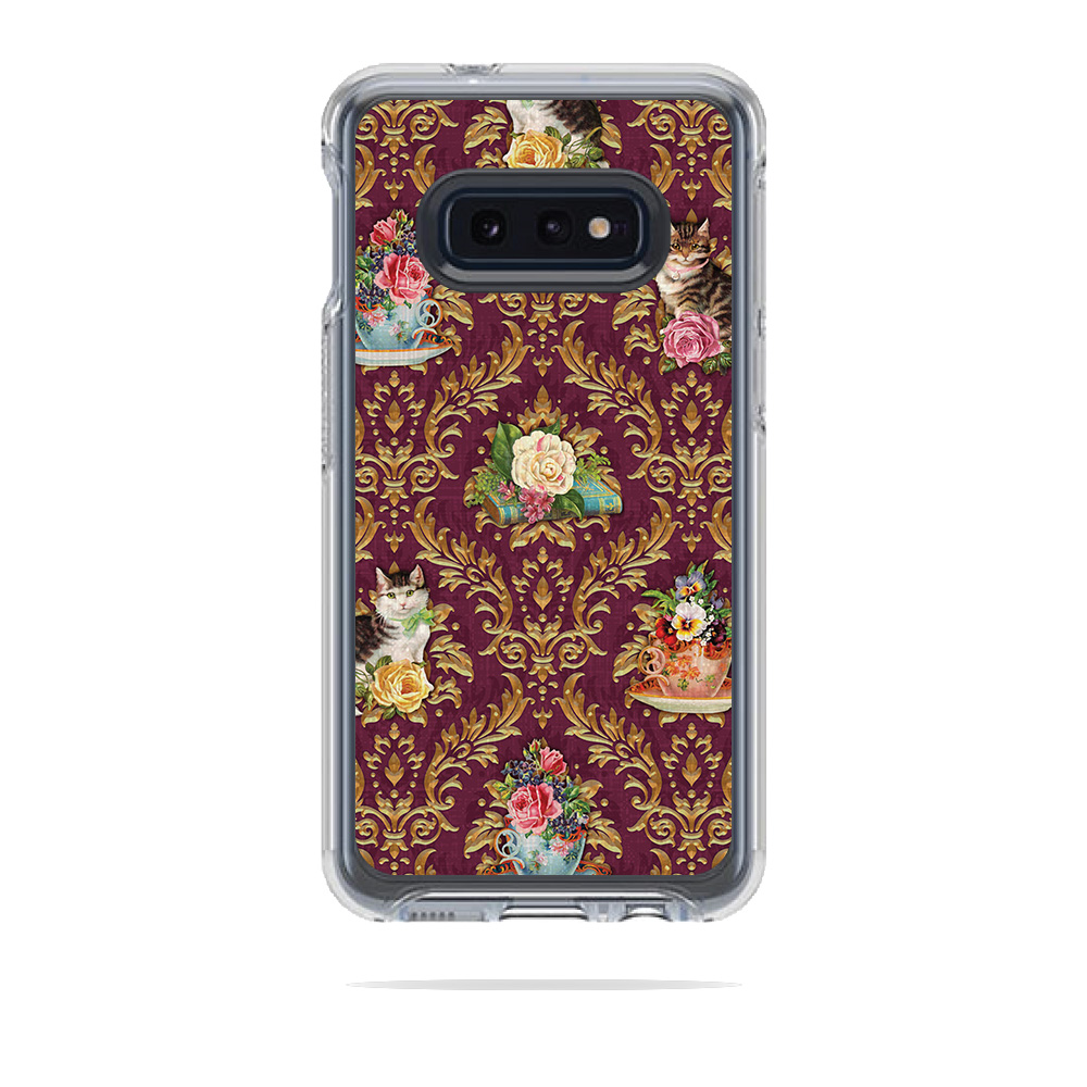 MightySkins OTSYSG10E-Teatime Cat Damask Skin for Otterbox Symmetry Samsung Galaxy 10E - Teatime Cat Damask