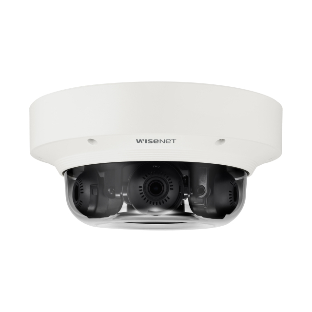 Wisenet P series network vandal outdoor Multi-Sensor Multi-Directional dome camera provides 3x 2MP sensors for a total resolution of 6MP. Each camera head features 30fps, a motorized vari-focal lens 2x (3.0~6.0mm) (107°~56.3°), maximum 321° FoV, triple codec H.265/H.264/MJPEG with WiseStream II technology, 150dB WDR, defocus detection, built-in analytics, true D/N, 2x SD card slots, hallway view, HLC, PoE+, IP66/IK10, -40°C ~ +55°C (-40°F ~ +131°F), White camera body. Manufacturer: Hanwha Group. Manufacturer Part Number: PNM-8082VT. Brand Name: Wisenet. Product Series: P. Product Model: PNM-8082VT. Product Name: 6MP (2MP x 3) Multi-Sensor, Multi-Directional Camera. Product Type: Network Camera. [Technical Information] Recording Formats: HD. HD Recording: Yes. Night Vision Distance: 1.64 ft. [Display & Graphics] Image Sensor Type: CMOS. Minimum Illumination: 0 lux. Color Supported: Color. Field of View: H: 107?(Wide)~56.3?(Tele) / V: 57?(Wide)~31.5?(Tele) / D: 126?(Wide)~64.3?(Tele). Effective Camera Resolution: 2 Megapixel. Number of Sensors: 3. [Video] Video Formats: H.265. H.264. MJPEG. H.264B. H.264H. H.264M. Maximum Video Resolution: 1920 x 1080. Maximum Frame Rate: 30 fps. Analog Video Signal Format: CVBS. [Lens] Lens Type: Varifocal. Minimum Focal Length: 3 mm. Maximum Focal Length: 6 mm. Lens Included: Yes. Minimum Aperture: f/2.2. Maximum Aperture: f/3.1. Optical Zoom: 2x. [Exposure] Shortest Shutter Speed: 1/12000 Second. Longest Shutter Speed: 2 Second. [Network & Communication] Connectivity Technology: Wired. Remote Management: Yes. [Physical Characteristics] Mount Type: Wall Mount. Pendant Mount. Ceiling Mount. Corner Mount. Pole Mount. Parapet Mount. Roof Mount. Box Mount. Backbox Mount. Gang Box Mount. Form Factor: Dome. Color: White. Diameter: 9.9". Weight (Approximate): 6.61 lb. [Envi