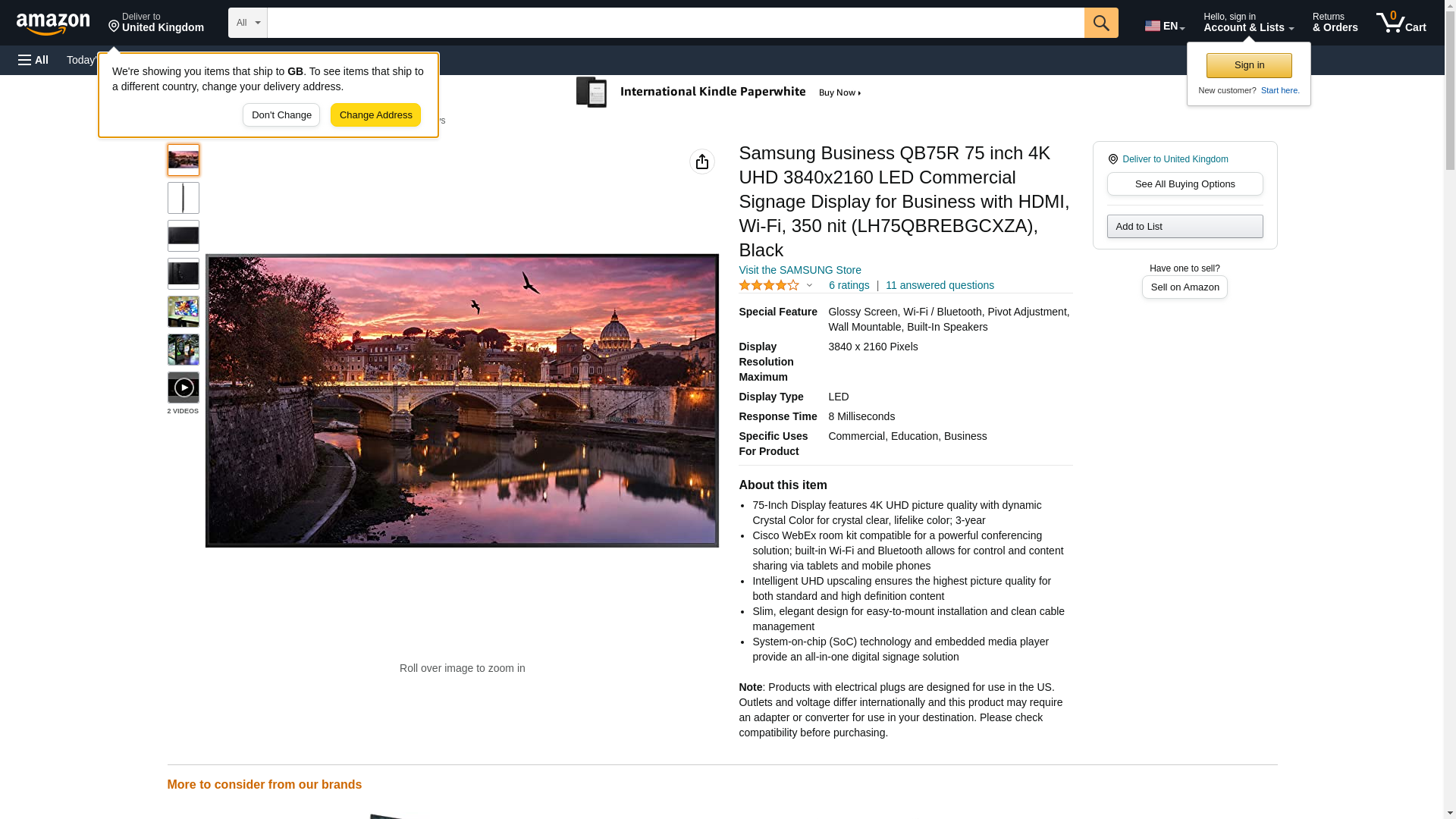 Samsung Business QB75R 75 inch 4K UHD 3840x2160 LED Commercial Signage Display for Business with HDMI, Wi-Fi, 350 nit (LH75QBREBGCXZA), Black